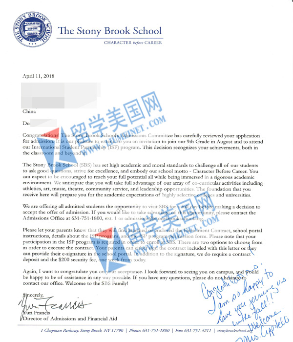 石老师曾走访考察过该校,石老师是从波士顿到纽约开车花费了近5个小时才到石溪中学,石溪中学的校园真的很美,到处充满着鲜花。校长和招生主任热情的接待了我们,我们今年一名非常优秀的学生刚刚成功补录到该校。校长介绍今年一名中国学生已经被MIT录取,学校的数学和科学课程很强,如果学生数学比较强的可以从10年级开始就去石溪大学就读学分课程,学校由于紧临石溪大学,完全可以享受大学资源。