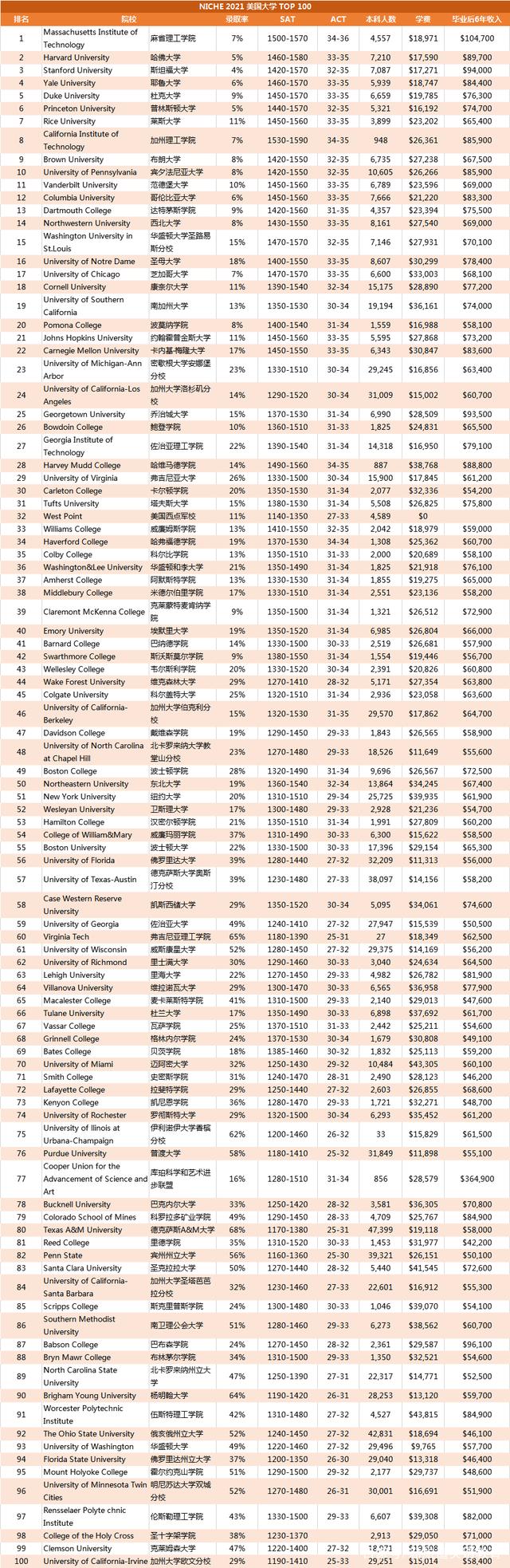 2021Niche美国最佳大学TOP100: