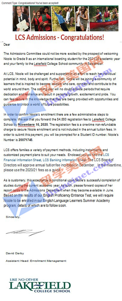 恭喜W同学被加拿大顶尖私立高中雷克湖学院录取展示: