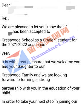 留美网J同学被加拿大顶尖走读高中凯斯伍德学校(Crestwood Preparatory College)录取~
