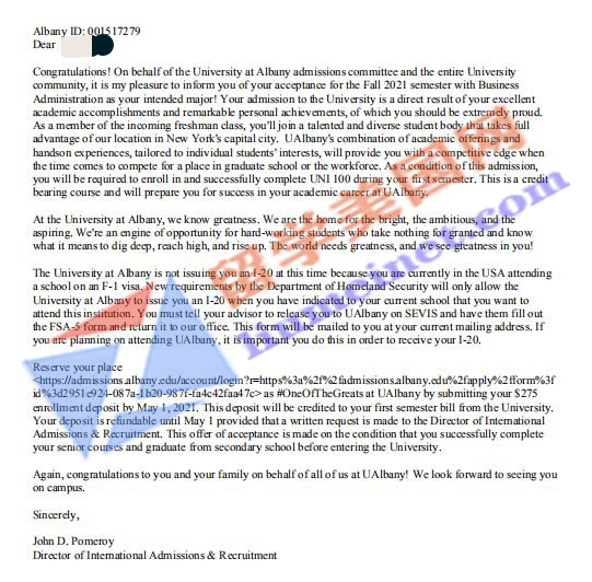2021年再传录取捷报~恭喜留美网Sean同学被美国阿尔巴尼大学University at Albany录取,经过石老师和留美网团队的共同努力,在Sean同学没有任何标化成绩的情况下成功帮助L同学申请到了理想的学校,恭喜留美网L同学~