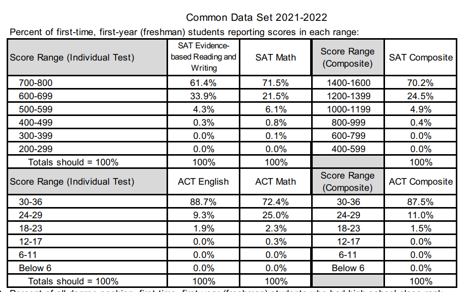 录取者中排名后25%的学生SAT成绩则在1360分,ACT成绩31分。