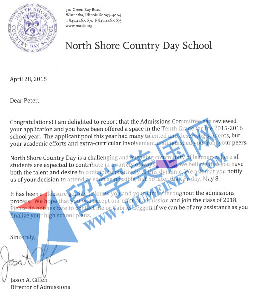 留美网学生北海岸乡村日校录取offer展示