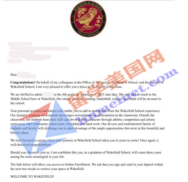 恭喜留美网X同学斩获走读高中韦克菲尔德学校Wakefield School录取~