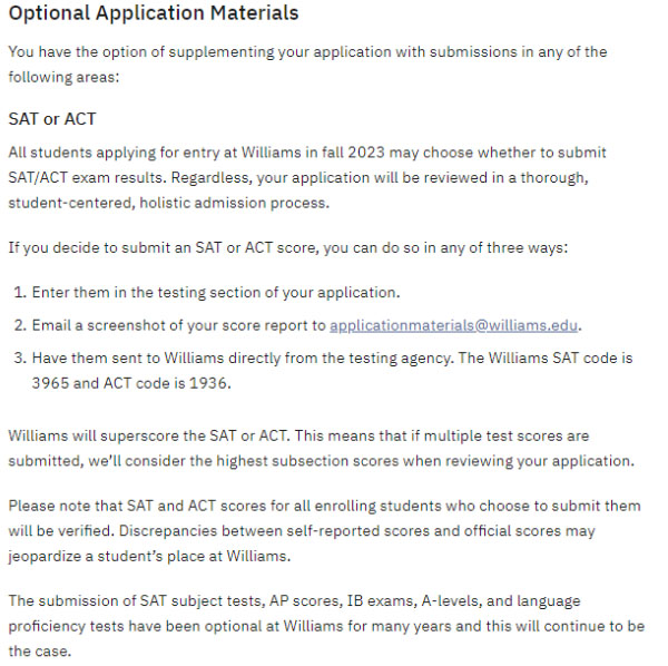 同时,针对2023年威廉姆斯学院本科申请标化是这样规定的: