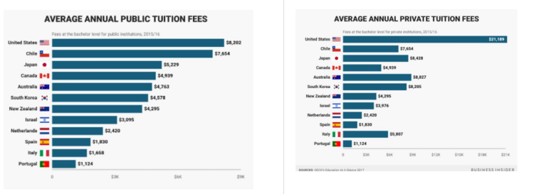 由美国《商业内幕》发布的一份报告,综合来看,在全球公立大学中,美国以平均8202美元/年,无疑当选最贵留学地区。美国私立大学的费用更是毫无疑问,以21189美元/每年的价格领先全球。