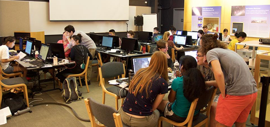 校园开课时间为7月9日,即学生抵达后的第二天。YSPA 课程在Leitner 数字天文馆剧院举行,每周大约两个小时,每周四到五天。我们使用混合“翻转教室”模式进行教学,其中学生在上课前学习了教科书和在线视频,然后课堂时间用于查看教师以不同方式呈现的材料,与之合作天文馆圆顶上的互动演示,并与教师和其他学生讨论材料。