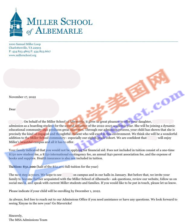 米勒中学位于弗吉尼亚州夏洛特维尔市,百年历史,距弗吉尼亚大学20分钟车程,占地1600英亩,有12英亩湖。高级教师比例79%.我曾考察过该校,学校位于山里,空气很新鲜,距离DC1小时车程。