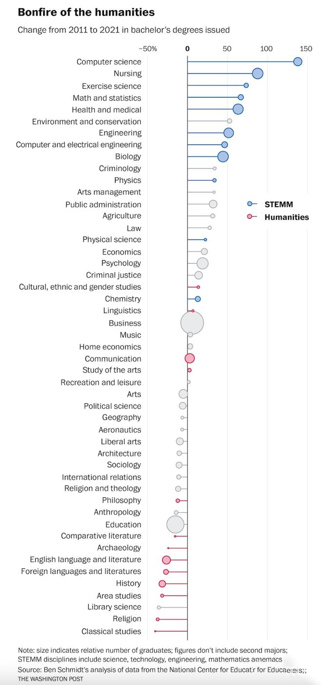 历史学家和数字人文主义者本施密特根据施密特对美国国家教育中心数据的分析,到2021年,相对于应届毕业生的整体规模,历史、英语和宗教等学科的毕业生人数不到2000年代早期鼎盛时期的一半统计数据。