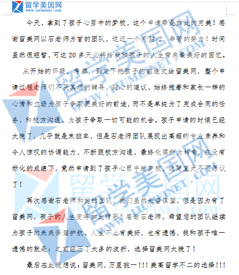 在此,留美网感谢W同学和家长的积极配合,在非常感谢石老师和团队老师们的付出,预祝W同学在今后的留美求学生活中收获更多的精彩,成就更加美好的未来!