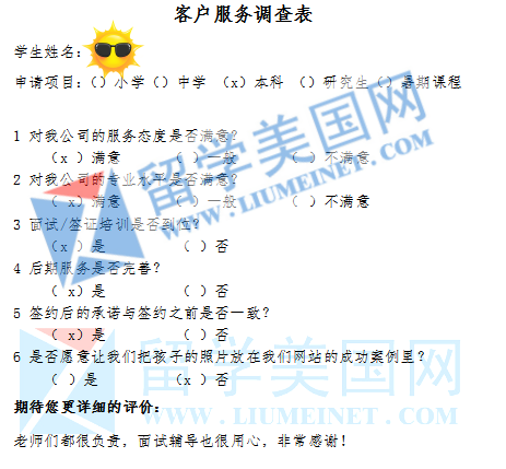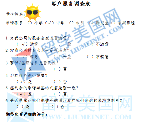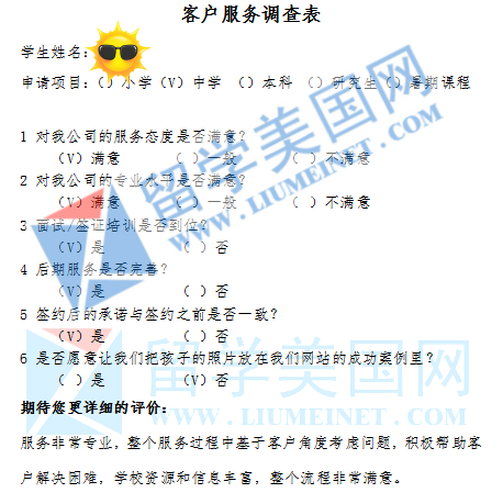 “机构认真负责专业,非常用心的去了解孩子成绩,性格和爱好,为孩子量身定制个性化的计划,并介绍和引导与之匹配的学校,我们家长非常满意,感谢留学美国网,感谢机构内各位老师一直以来的用心陪伴。祝愿留学网越办越好,使得更多的家长和孩子申请到最适合的学校。谢谢!我们非常满意留美网的服务,希望有更多的孩子与家长了解到你们。”