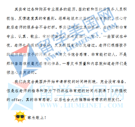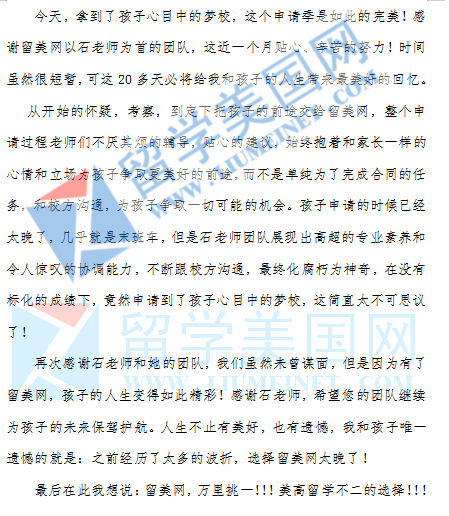 “今天,拿到了孩子心目中的梦校,这个申请季是如此的完美!感谢留美网以石老师为首的团队,这近一个月贴心、辛苦的努力!时间虽然很短暂,可这20多天必将给我和孩子的人生带来最美好的回忆。