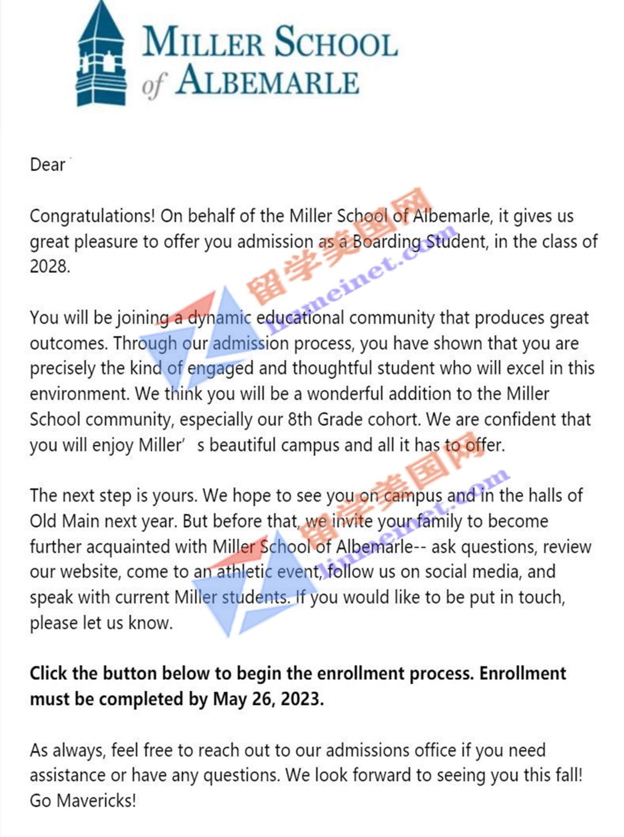 再次祝贺W同学成功斩获米勒中学的录取offer和一次性顺利拿到签证!预祝今后在米勒中学的美高留学生活中收获更多的精彩和成长,成就更加美好的未来!