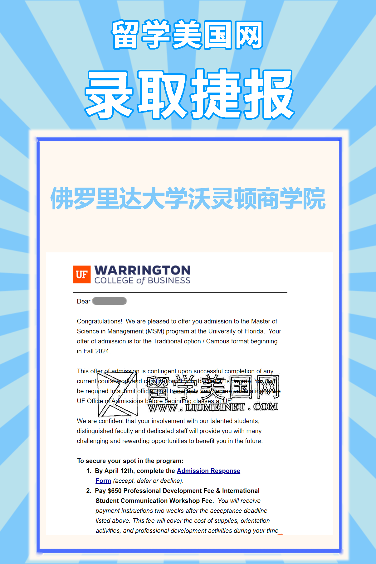 恭喜留美网同学,成功获得美国佛罗里达大学录取! 拿到这枚录取无论是对于留美网还是对于学生来说都是非常值得庆幸的事,我们能够在标化成绩不是非常满意的情况下为学生争取到录取机会,作为该生的申请亲历者和见证者留美网感到非常高兴且欣慰!希望该同学在未来的学习生活当中能够获得长足的进步和理想的结果!