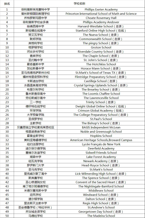 2024美国私立高中排名TOP50