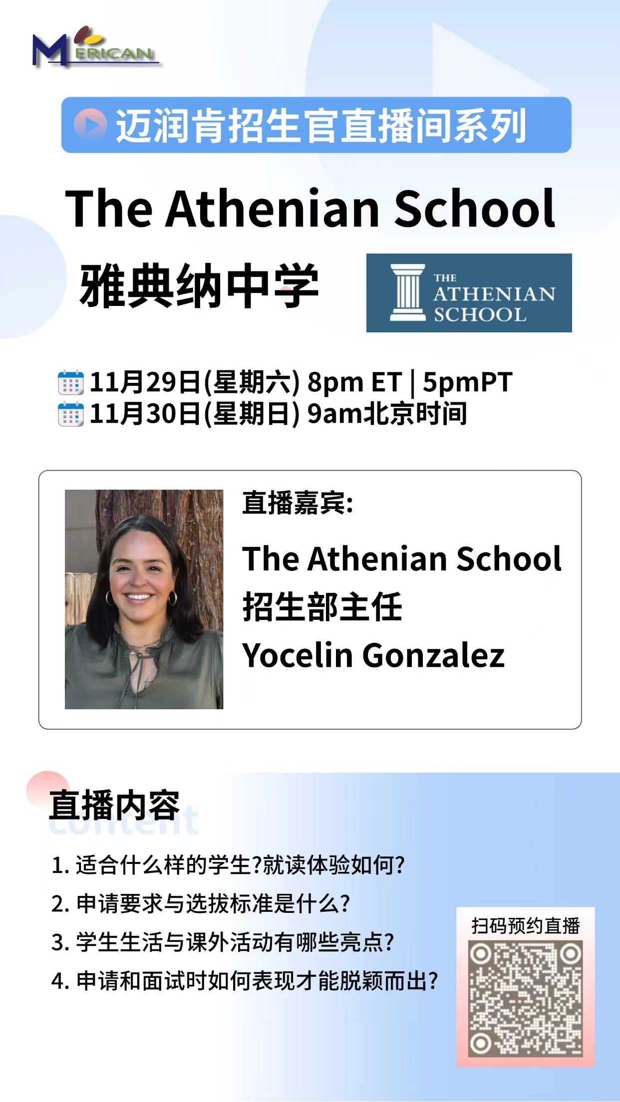 直播预告|美国顶尖寄宿高中雅典纳中学招生官11.30直播详解2026申请,含在读生真实分享! 11月30日上午9点美国顶尖寄宿高中雅典纳中学The Athenian School招生官要来做客我们直播间啦!另外还有我们的学生用自身经历来给大家分享在雅典纳中学的点点滴滴!直击美高申请核心,聆听真实校园声音!感兴趣的家长抓紧时间预约! 一、直播亮点抢先看 招生官亲临直播间 揭秘2026招生政策与录取偏好 解析申请文书核心评估标准 独家分享面试加分技巧 在读学生真实分享 从体制内到美高的适应历程 在学校体验如何都参加了哪些体育活动 如何利用学校资源规划个人成长 干货满满,另外招生官还会为家长朋友们解答疑惑!感兴趣的家长抓紧时间扫码预约~ 雅典纳中学The Athenian School介绍: Athenian School留美网有学生就读,位于旧金山湾区,蒂阿波罗山脚下,离旧金山32英里。雅典娜学校非常注重于学生的全面发展,智力的开发,增强体质,品质,价值观,审美敏感度。 学校优势: 1.工程和设计:学校有自己的创客工作室,创客工作室还主持了雅典人的飞机项目——机器人技术、电动汽车项目、3D打印机、电脑控制路由器、激光切割机以及一系列工具、电子设备和其他制造设备 2.开设企业家课程,如有学生对某些学校课程以外的领域感兴趣并愿意深入研究,他们可以在老师的帮助下进行。 3.领导力项目,学校开设有创业俱乐部,培养学生的创业精神。 4."雅典的精神"飞机项目:每年约有55名学生参加飞机项目,组装一个完全功能,联邦航空局批准的两座飞机。校内提供飞机组装间,学生可以从铆接机翼到安装引擎,雅典学生成功地完成了两个派珀飞机。 5.雅典机器人项目(ARC):二十世纪初,响应学生带领第一个机器人团队,ARC成立。通过加入机器人程序,学生将得到专业工程师的指导,建立和完成自己设计的机器人,学习复杂的硬件和软件,从构思到完成,一个复杂的工程项目。 学校概况: 建校时间:1965年 学校性质:合校 宗教性质:非宗教 校园面积:75英亩 学生数量:530人 国际学生比例:12% 中国学生比例:5% 高级教师比例:74% 学制:两学期制度 开设年级:6-12年级、PG AP课程:8门 招生年级:9-12年级 ESL:提供 SAT均分:1385 平均班级人数:15-17 四年制大学录取率:100% 师生比例:1:9 寄宿比例:12% 学校设施: 雅典娜的校园在不断发展,最近增加的设施包括一个新的有餐饮设施的大楼,卡特创新工作室,和三个新的教学楼,雅典娜中学在确保为ADA无障碍校园方面取得了重大改进。 雅典娜其他的设施包括游泳池、草皮足球场、健身中心、高尔夫球场、两个健身房、一英里小径、舞蹈工作室和音乐练习室、一个跨信仰空间、冥想室、大型餐厅、黑盒子剧院以及探索、放松的户外开放空间。 特色项目: 1.生活技能/社会学 九年级时,所有学生都学习社会学:社会与自我。该课程从各种角度审视学生身心健康:性别、饮食和锻炼、心理健康、学习风格和睡眠。他们离开课程时将有一个深入的自我照顾计划,这将有助于他们最好地通过高中的严格要求茁壮成长。 2.雅典娜荒野体验 在雅典娜学校,我们致力于培养学生的团队精神、自我反省、同情心和韧性。雅典娜的学生将有机会参加实践活动,其中一次机会是参加雅典娜荒野体验(AWE)。一个小组的学生将在11年级期间探索高山山脉或死亡谷沙漠的美丽和迷人。学生们一起在越野地形中导航、烹饪集体餐、攀岩和建立营地,学校希望学生能够了解技术、日常、家庭作业,同时学习如何协作、解决问题、同情他人以及相信自己和他人。每年两次,分别在3月和8月。 3.社区服务 社区服务是雅典教育不可分割的一部分,存在于6-12年级学生的教室内外。在高中,社区服务计划为学生提供广泛的机会,让他们完成所需的服务时间。学生在雅典娜学校附近或者世界各地参加环境清理,家教,食品银行分发,和许多其他活动。 4.工程与设计 工程与设计是雅典娜的一个新部门,其理念是创造和制造是重要的技能。学生有机会在雅典娜的制造商工作室进行与美术,科学,人文学科相关的各种工作。 此外,制造商工作室还承载着雅典的飞机项目、机器人、电动汽车项目、3D打印机、计算机控制路由器、激光切割机以及一系列工具、电子产品和其他制造设备。本部门提供的一些核心课程包括基于项目的计算机编程简介、制作类的艺术与科学、CAD编程和应用科学。 5.三月学期 在这些为期三周的迷你课程中,学生将深入探讨各种身临其境的体验。这些课程可能包括国际和本地旅行、学生推动的实践项目、服务工作和独立调查。2020年3月学期从3月12日星期四到3月31日星期二。 6.创业计划 由现任家长和受托人劳拉·维克托里诺发起,创业计划已发展到包括介绍课程、持续课程和独立研究。单独工作或在一个小团队中工作,您可以通过开发和推出自己的产品或服务来培养您的创业技能。此外,还有一个创业俱乐部,供没有时间上课的爱好者参加。 这些学生在课堂中曾开发出行李追踪设备、梦幻运动应用程序、潜水员相机安装、连接志愿者的应用程序、在线商学院、家教服务、实习安置服务和电影/演讲系列。 近年毕业走向: 100%四年制大学录取率!近年毕业走向包括:哥伦比亚大学、斯坦福大学、芝加哥大学、麻省理工学院、宾夕法尼亚大学、约翰霍普金斯大学、达特茅斯学院、西北大学、布朗大学、康