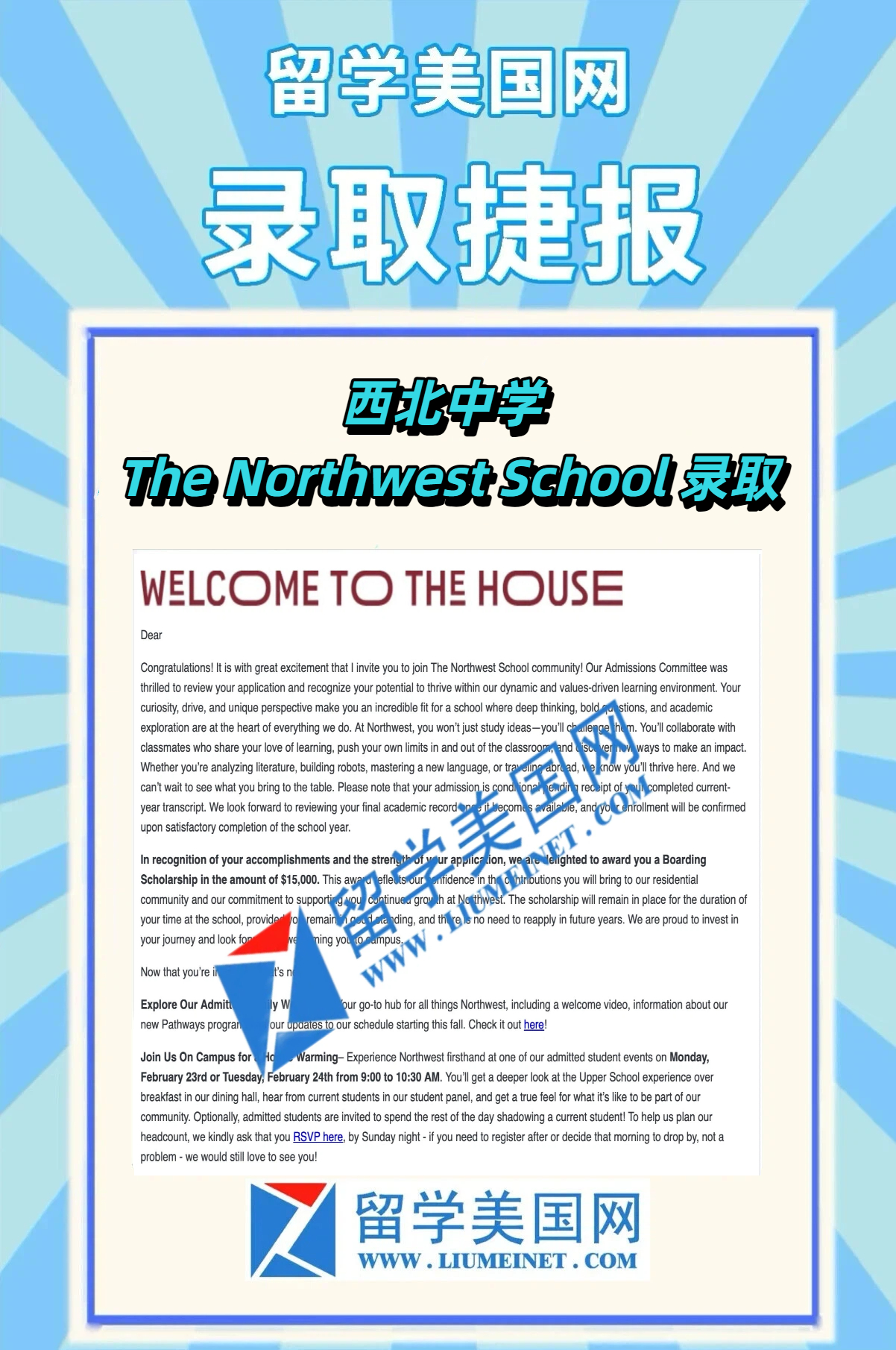 祝贺周同学在没有标化成绩的情况下成功获得美国顶尖寄宿中学——西北中学(The Northwest School)录取,并荣获15000美元奖学金!