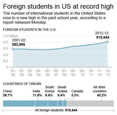 2012到2013学年,共有82万国际学生在美国大学留学,比上年增长7.2%,已经连续7年增长,中国留学生连续猛增成为美国国际学生持续增加的主要推动力。外国留学生去年估计总共为美国经济贡献了240亿美元。