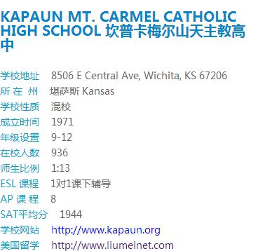 KAPAUN MT. CARMEL CATHOLIC HIGH SCHOOL 坎普卡梅尔山天主教高中是由建于1889年及1951年的两所知名学校于1971年合幵而成,是一所学术体育双强校。学术斱面,其SAT平均分高达1944,曾连续5年赢得州际 科学奥林匘克竞赛,每年有超过三分之一的学生升入美国TOP50大学。该校以白人学生为主,师生关系融洽,尽显中部人民友好热情的性情。