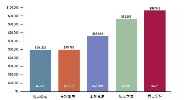 美国人用一个专有名词来形容这个过程:“教育阶梯”(educational ladder)。大部分孩子在 5 岁时进入幼儿园,也有一些在 3、4 岁时进入学前教育班。然后,小学一般花 5 到 6 年,初中 2 到 3 年,高中 4 年。高中毕业后,绝大多数学生会进入大学,还有一些会在社区学院读 2 年,学习职业技能,取得“类似学士学位”(类似于我国的专科学历)。一般来说,学士学位已经能帮助人们找到一份不错的工作了,不过也有些专业要求必须有硕士甚至博士学位,比如法学和医学。一般来说,工资和学历紧密挂钩(如图所示):