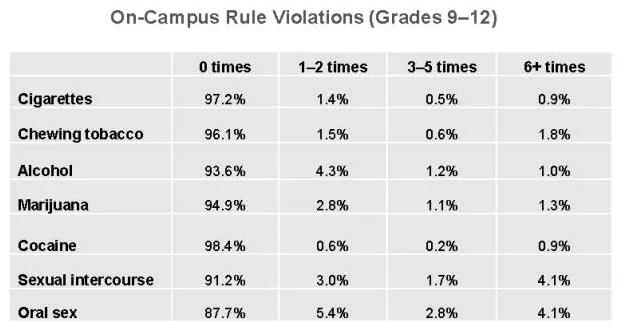 三分之一学生有过非实质性性行为,四分之一学生有过性生活 看完学生的睡眠情况,接下来为你们透露一些让家长最担心的问题:吸烟、酗酒、用药、性行为等。 首先,我们来看一下9-12年级学生在校违反校规的情况: