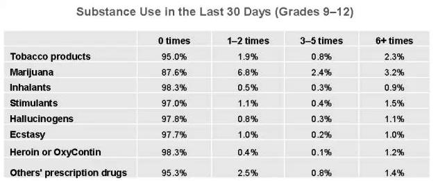 相对于学生发生性行为的情况,学生使用违禁药品的情况就稍微好一些了。在调查中,87.4%的学生称他们从未被给予或是购买违禁药品。有8.6%的学生表示自己使用过1-2次,2.2%的学生使用过3-5次,有1.8%的学生使用违禁药品达6次以上。 下面是学生在过去30天使用违禁药品情况的调查。在表格中,大麻的比重最多,其他例如迷幻剂、海洛因等较少。细心的读者可以发现,最后几项违禁药品:海洛因、迷幻药、致幻剂等使用6次以上的学生占比差不多,很可能会有重复吸食不同药品的“重瘾者”。