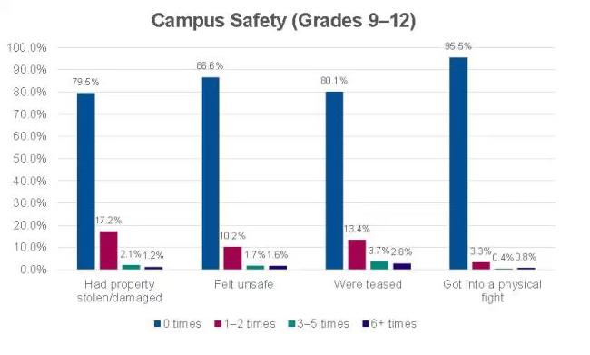 相信很多家长都会担心孩子无法融入,或者被欺负诸如此类的问题。这类问题是美国校园中一直存在的,在调查中,有28.2%的高年级学生和35%的低年级学生都曾经被人欺负过。 除了此类问题之外,盗窃、被戏弄、打架等问题也在调查问题之中,在表格中可以发现,各类问题都曾经出现,其中财务被盗或损坏发生的概率最高;被戏弄发生的概率最小,但经常被戏弄的学生比例最高。