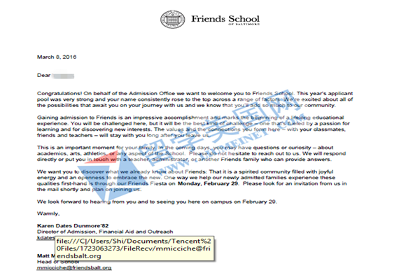 恭喜留学美国网www.liumeinet.com/index.php裴同学被巴尔的摩贵格会学校录取!今天是妇女节,裴同学的offer对于妈妈来说,无疑是最好的节日礼物,相信裴妈妈一定会非常开心,非常欣慰的!