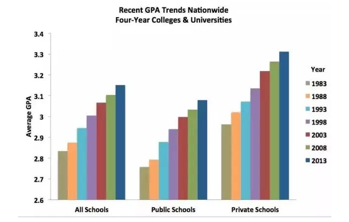 前杜克大学的教授Stuart Rojstaczer和福尔曼大学的教授Chris Healy收集并分析了美国400多所学校近70年来的学生成绩数据,发现美国确实存在并一直存在GPA膨胀现象。