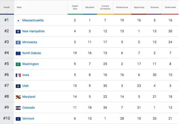 综排前十的各州分别为:麻塞诸瑟州、新罕布什尔州、明尼苏达州、北达科他州、华盛顿州、爱荷华州、犹他州、马里兰州、科罗拉多州和佛蒙特州。