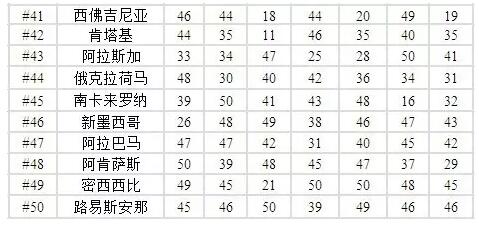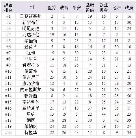 除了教育实力外,各州在基础设施建设、社会治安、政府能力等方面都各有高低。这里附上全美50州综合排名完整榜单,为小伙伴们以后在美国就业、生活提供一份最直观的参考资料。
