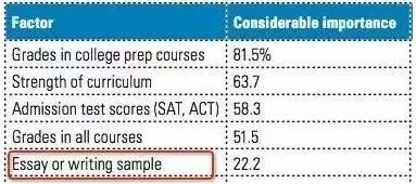 美国全国大学招生顾问协会(NACAC)的招生趋势调研(Admission Trends Survey)中,文书与写作案例(Essay and Writing Sample),几乎每年都排在No.5的位置: