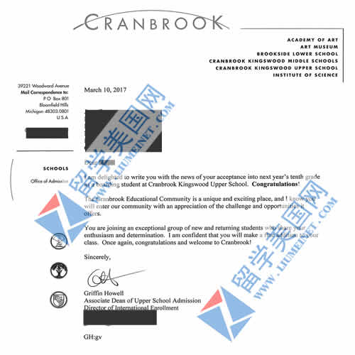 恭喜管同学获得全美排名第19的Cranbrook Schools克莱布鲁克中学录取offer