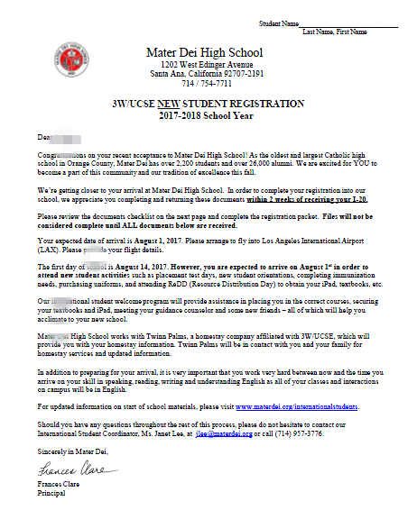 好消息:恭喜X同学成功补录到Mater Dei high school!这个offer来之不易,凝聚了留美网全体员工的付出和心血,祝X同学在美国前程似锦,展翅高飞!学业有成!