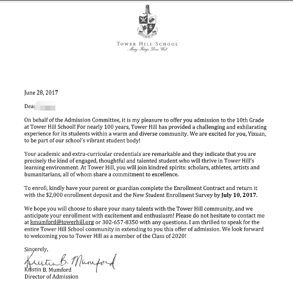 导读:恭喜蔡同学成功补录到顶尖走读高中Tower Hill School(特拉华排名第一)!蔡同学本身非常优秀,留美网老师深度挖掘蔡同学身上的特长和亮点,总结,整理,通过漂亮的文书展现,与招生办老师不断的邮件往来,跟进,追踪,最终帮蔡同学争取到了顶尖高中的offer,祝蔡同学在美国前程似锦!学业有成!》》更多美国高中名额情况咨询400-000-7805!石老师专家微信号:liumeinet2014
