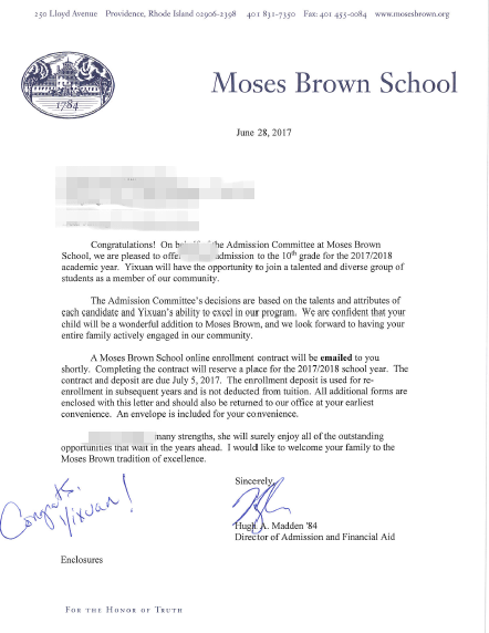 恭喜C同学成功补录到顶尖高中Moses Brown School!(罗德岛顶尖高中)