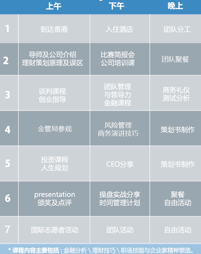 在全球顶尖金融公司参与为期7天6夜的工作实战,全程由企业高层全方位指导,通过浸泡式的职业学习体验,了解企业的文化、愿景,还有金融分析、理财技巧、职场技能与企业家精神塑造的课程。参与学员可以通过自己的努力获得世界100强企业高层亲笔签名的推荐信,表现特别优异者有机会获得项目海外游学奖励金。