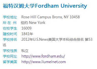 福德汉姆大学是一所中等规模的私立大学,知名度在纽约仅次于哥伦比亚大学和纽约大学。校园建筑古典庄重,学院气氛浓。佛罕大学的教育在宗旨上即是国际性的。在纽约这个国际性大都市,佛罕大学充分利用身处国际商务、外交、信息、艺术、科技中心的优势,让学生在这个特殊的教室里获益匪浅。