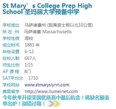圣玛丽中学位于波士顿市区以北10英里的林恩(Lynn),林恩有9万多人口是麻省历史名城之一,这里是EG electric的老家,第一台EG的飞机就是在这里制造出来的,林恩坐落在马萨诸塞港湾和大西洋湾,交通便利。林恩夏季湿润冬季多雪,春秋季节温和,非常适宜居住。林恩还有新英格兰最大的市政公园,林恩有3所公立中学,1所私立中学就是St Mary High School.学校建立于1881年,建校初期是一所男校,后期又增加了女生教育,变为男女混合学校。在1989学校是一所初中,从7年级教育开始教学起步,接下来增加了8年级教育,在2011年增加了6年级教育。2006年圣玛丽正式的合并为一个私立学校,从波士顿地区的大教主管区(Archdioeese of Boston)独立出来,创立了新的管理模式。