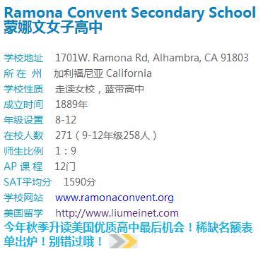 综合实力很均衡的女子高中,学校是加州历史最悠久的学校之一,建校时间甚至早于斯坦福大学(1891年建立),两度获得蓝带称号,学校坐落帕萨迪纳(Pasadena)南部,这里有洛杉矶地区的地标:加州理工大学,玫瑰碗体育场还有蒙特利公园(Monterey Park)北部地区(是全美最大的华人聚集区)。