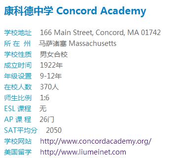 学校位于马萨诸塞州,成立于1922年。建立之初为女子学校,1971年成为男女合校。康科德高中是一所寄宿、走读的全日制男女合校的著名私立中学,提供1-12年级课程及大学预备课程。学校占地39英亩,优美校园,设备完善,离波士顿18英里,距剑桥市约30分钟,到logan国际机场大约1个半小时