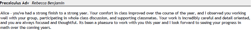 中文:你今年的表现非常棒。在这一年里,你在课堂上越来越如鱼得水,你和你的小组配合的很好, 你积极参与课堂讨论, 并热心帮助同学。你对学习非常细心,注重细节。你总是很专注且深思熟虑。今年和你一起工作,我很快乐并期待看到你未来几年在数学上不断进步。
