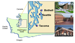 华盛顿大学位于华盛顿湖(Washington Lake)和波蒂奇湾(Portage Bay)及联合湾(Union Bay)之间,占地超过700英亩。交通非常便利,从学校到西雅图市区只需要15分钟的车程。除了西雅图校区提供博士学位的学程以外,华盛顿大学还有Bothell与Tacoma两所分校提供学生到硕士学位的学程。西雅图主校区包括17个学院,为一年级新生到博士在读生提供课程和科研机会。Bothell与Tacoma分校主要为高年级的大学生和研究生提供各种课程。