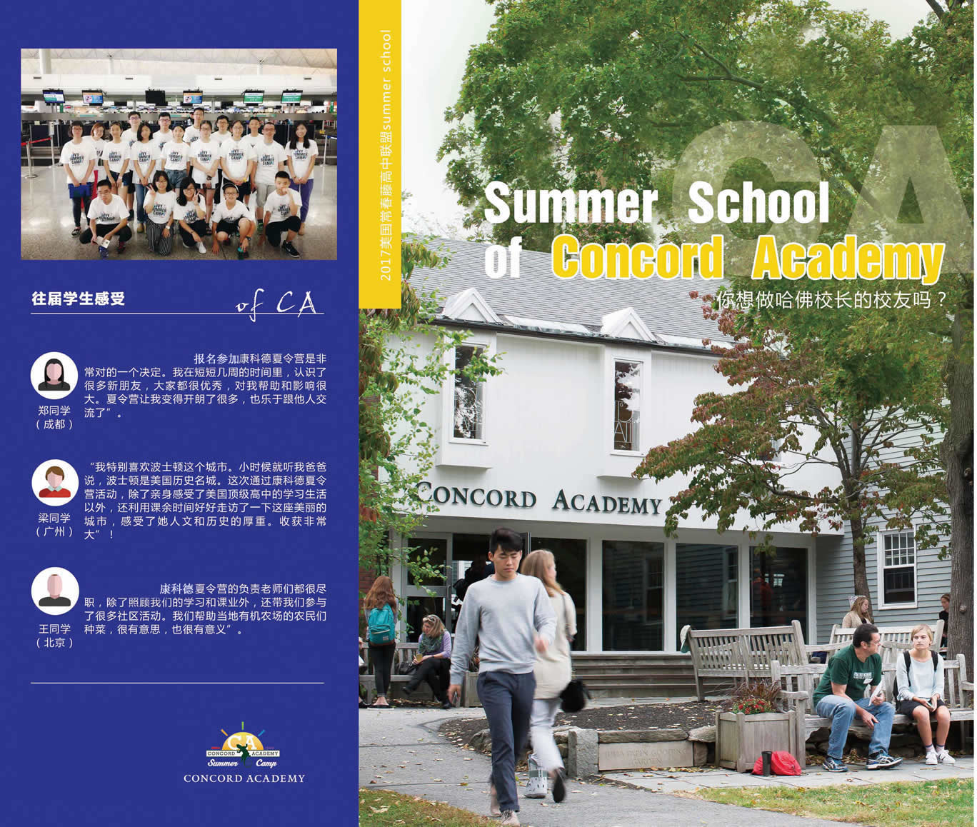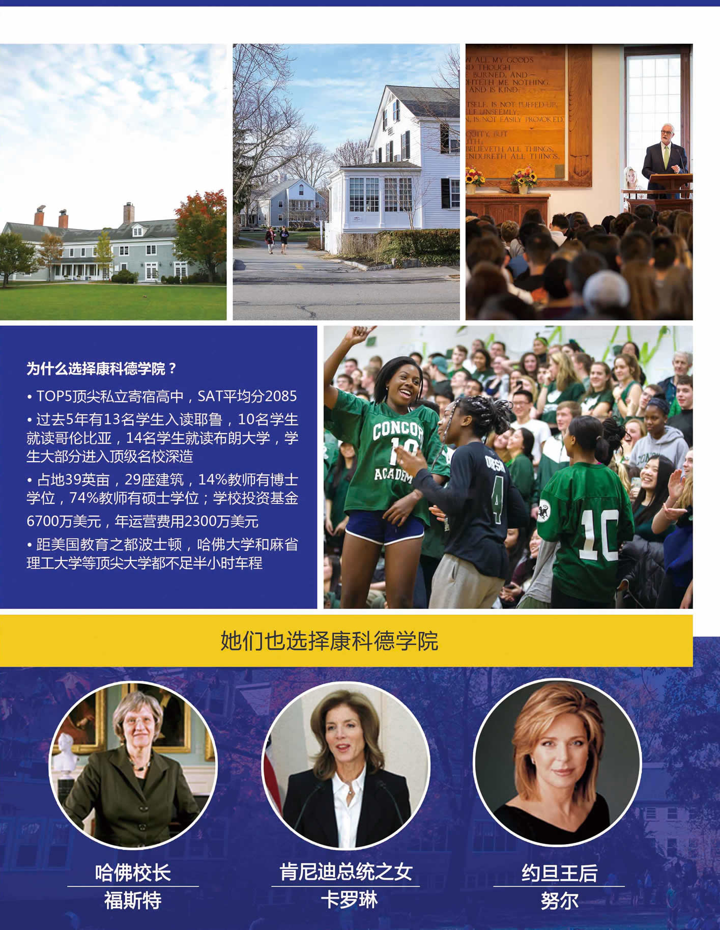 学校位于马萨诸塞州,成立于1922年。建立之初为女子学校,1971年成为男女合校。康科德高中是一所寄宿、走读的全日制男女合校的著名私立中学,提供1-12年级课程及大学预备课程。学校占地39英亩,优美校园,设备完善,离波士顿18英里,距剑桥市约30分钟,到logan国际机场大约1个半小时