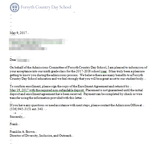 好消息:恭喜S同学成功补录到Forsyth Country Day School!这个offer凝聚了留美网全体员工的努力和心血!感谢所有的家长的支持和信任!祝S同学在美国展翅高飞!前程似锦!