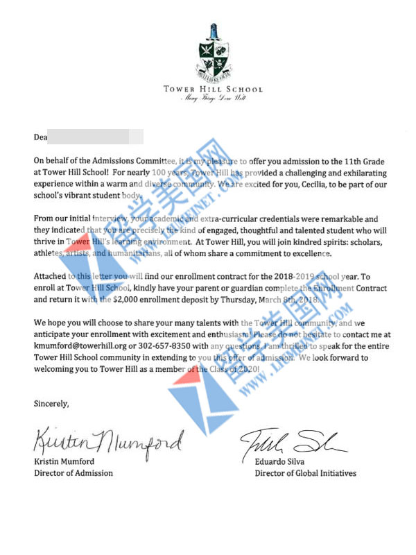 重磅消息!恭喜WXH同学成功获得tower hill 录取offer!