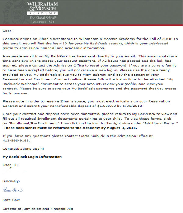 成功案例:恭喜留美网陈同学补录到韦伯拉汉莫森学校