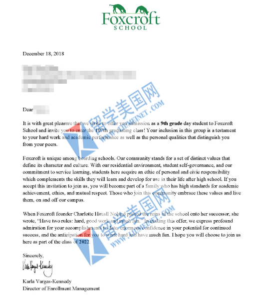 恭喜留美网同学获得优质寄宿女校--福克斯克罗夫特学院(Foxcroft School)录取,微信咨询:liumeinet2014