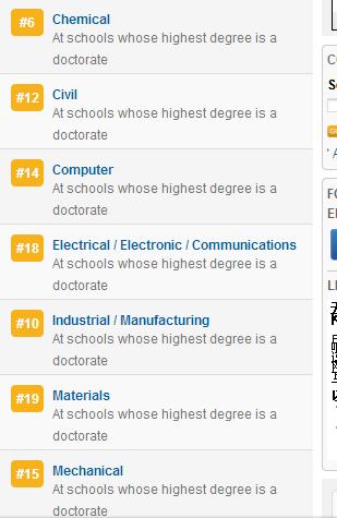 下面是工学院的具体专业排名,核工程全美第3,化学工程全美第6.