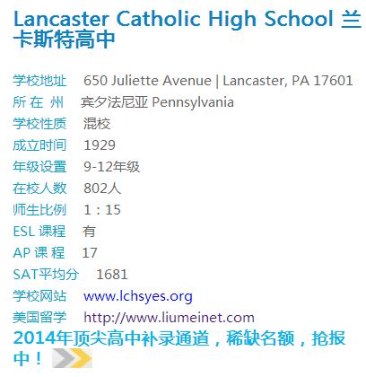 兰卡斯特高中成立于1929年,占地 面积约30英亩,是一所提供全日制9至12年级 较大规模的私立高中。学校目前注册高中学生 800名,教职工88名,其中32名教师拥有硕士 或博士学位。学校以家庭氛围著称,学生和教师关系相当融洽。兰卡斯特高中以科学及艺术方面的成绩突出。学生屡获全美科学和艺术竞赛大奖。2008年,兰卡斯特高中学生获得美国总统奖,美国英特尔科学竞赛奖,全美环保工程奖,全美博物馆和自然历史竞赛奖。每年该 校学生都会获得地区各类学术竞赛60%的奖项。学校课程设置相当丰富,在科学和艺术领 域为优秀学生提供了各种富有挑战性的课程和课外项目。学生在科技和艺术方面的兴趣和特长能得到充分发挥,学校每年都有大量的学生进入众多全美顶尖大学。